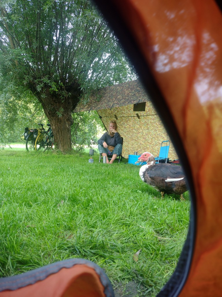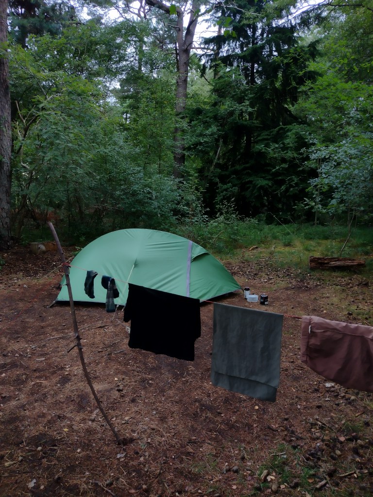 Het is een stikkend hete dag. Ik was juist zalig gelukkig met de regenachtige weken de afgelopen tijd, zo midden in de zomer, niet wat je zou verwachten van iemand die in een tent woont. Een medewerker in de natuurwinkel waar ik regelmatig kom zei al: ‘ik dacht nog aan je met die regen’, suggererend dat het een trieste boel zou zijn bij mij. Het tegendeel is waar, ik houd van regen. Allereerst houd ik van de geur van een nat bos en van het idee dat alle planten lekker veel water krijgen. Ik hou van vruchtbaar, groen, fris en weelderig en regen is daar samen met de zon onmisbaar in. Dan kan je nog zeggen dat je ervan houd als het geregend hééft, maar niet per se als het regent. Maar ook dat vind ik heerlijk. Een dik wolkendek, tikkende geluiden op de tent. Grijs weer nodigt uit om lekker niets te doen en gewoon een beetje te wachten tot de zon weer komt. Donkere luchten passen bij traag doen, alleen zijn en rusten, waar ik erg van geniet.