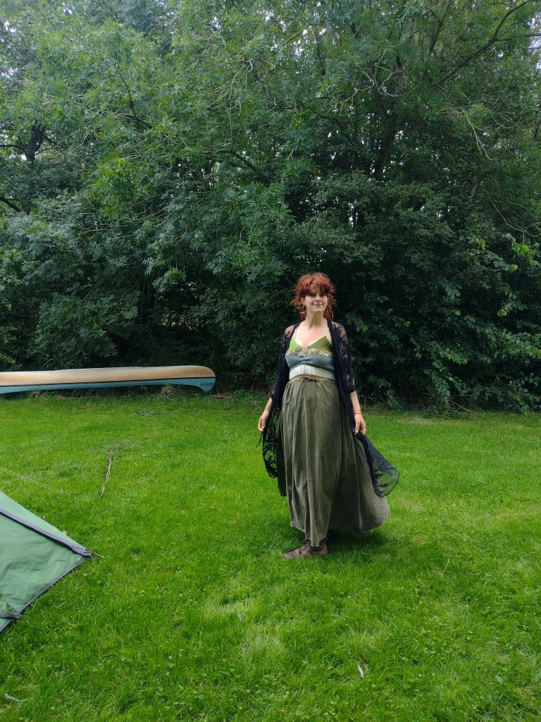 De afgelopen maanden mocht ik van mezelf losgaan met kleding, want ik word gewoon erg blij van leuke kleurtjes combineren en me uit te drukken middels wat er aan mijn lijf hangt. Ik vind het leuk als mensen aan me kunnen zien dat ik een bosheksje ben, dat ze kunnen zien dat ik blij door het leven ga, dat het van me uitstraalt dat ik lekker doe waar ik zin in heb. Ik vind het leuk om me mooi te voelen en kleding staat soms echt in het verlengde van hoe ik me voel. Zwarte t-shirts met duistere opdrukken (humans stay away!) als ik menstrueer, of een zwierige jurk met hoge split als ik me een sexy godin voel. In de winter liep ik 24/7 in dezelfde outfit rond, omdat ik dan geen zin had in omkleden en kleren vooral een praktische functie hadden. Maar in de loop van maart was ik steeds meer bij mijn ouders te vinden om weer eens een nieuwe kledingstuk erbij te pakken en er een oude voor in de plaats terug te stoppen. Omdat ik toch behoefte bleek te hebben aan afwisseling bij de tent bedacht ik op een gegeven moment: ik mag zo veel kleding mee als in mijn backpack past. Het weegt toch niet zoveel, dus dan kan ik het prima op mijn rug dragen, en dan hoeft het niet in de geringe ruimte in mijn fietstassen – naast al mijn kampeerspullen – gepropt te worden.