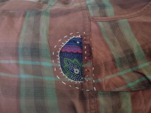 ’s Avonds ging ik lekker in het raamkozijn zitten en rook een aangebrande geur. Wat vaag, niemand was aan het koken? Voor ik het wist zag ik een vlam in mijn ooghoek: mijn broek stond in brand! Ik was blijkbaar in een kaars gaan zitten! Geen ernstige brandwond en ergens was ik blij, ik ben gek op kleding repareren en daarmee oefenen 😂 En ik ben heel trots op het resultaat dus die deel ik even met jullie: