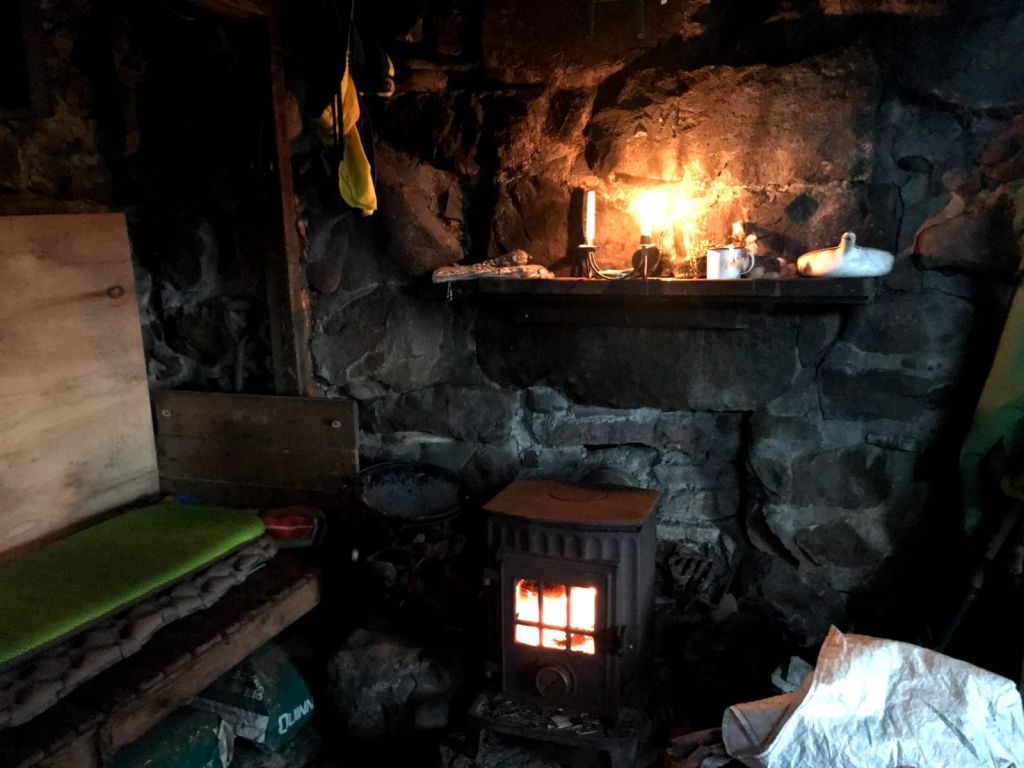 Ted had in ieder geval een goed idee: hij wist een leuke bothy in the middle of nowhere die niet bekend was bij het grote publiek. We reden twee uur met de auto (heel normaal hier in Schotland, waarom doe ik dat niet vaker in NL, even naar Duitsland voor het weekend?!) en hiketen door een moerassig gebied. Helaas: er kwam rook uit de schoorsteen. Een viertal dertigers zat lekker te eten en leek niet blij met onze komst. Normaal is de bothycultuur dat je lekker plek maakt voor elkaar, dat je de bothy deelt hoort er nou eenmaal bij. Maar deze mensen deden een beetje kortaf en hun benauwde mopshondje stikte zowat ’s nachts. Dat zou komen doordat wij de kachel te hoog hadden opgestookt, het leek ons eerder dat zij niet zo’n achterlijk doorgefokt beest hadden moeten kopen (zeiden we niet hardop). Anyway, het hondje was wel erg lief en kwam bij mij op schoot.