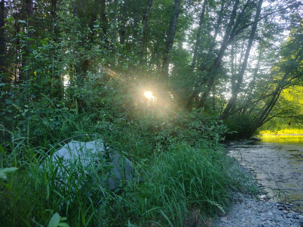 Ontzettend moe van de dag vond ik aan het einde van een zijpaadje een beschutte zijloper van de rivier. Het was er een beetje donker, maar wel uit het zicht van de grote rivier en het hoofdpad en toch ook wat opener dan in het wilde bos zelf. En kamperen bij water is toch wel echt bijzonder handig. Ik waadde op mijn nep-crocs door de rivier op zoek naar een overhangende tak om mijn zakken met eten aan op te hangen, en zag op een plekje waar het water minder hard stroomde allemaal rivierkreefjes om m’n voeten lopen. Ik vond het een beetje griezelig maar ook wel lief; het is gewoon weer iets waar ik aan moet wennen. Aan de kant zag ik allemaal kreeftenpootjes liggen met daarachter een soort wild paadje. Brrr, vast een geliefd plekje van de beer of wie dan ook voor een hapje.