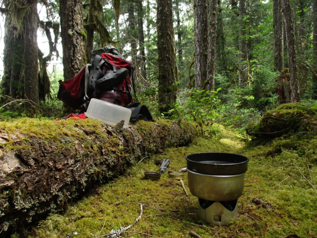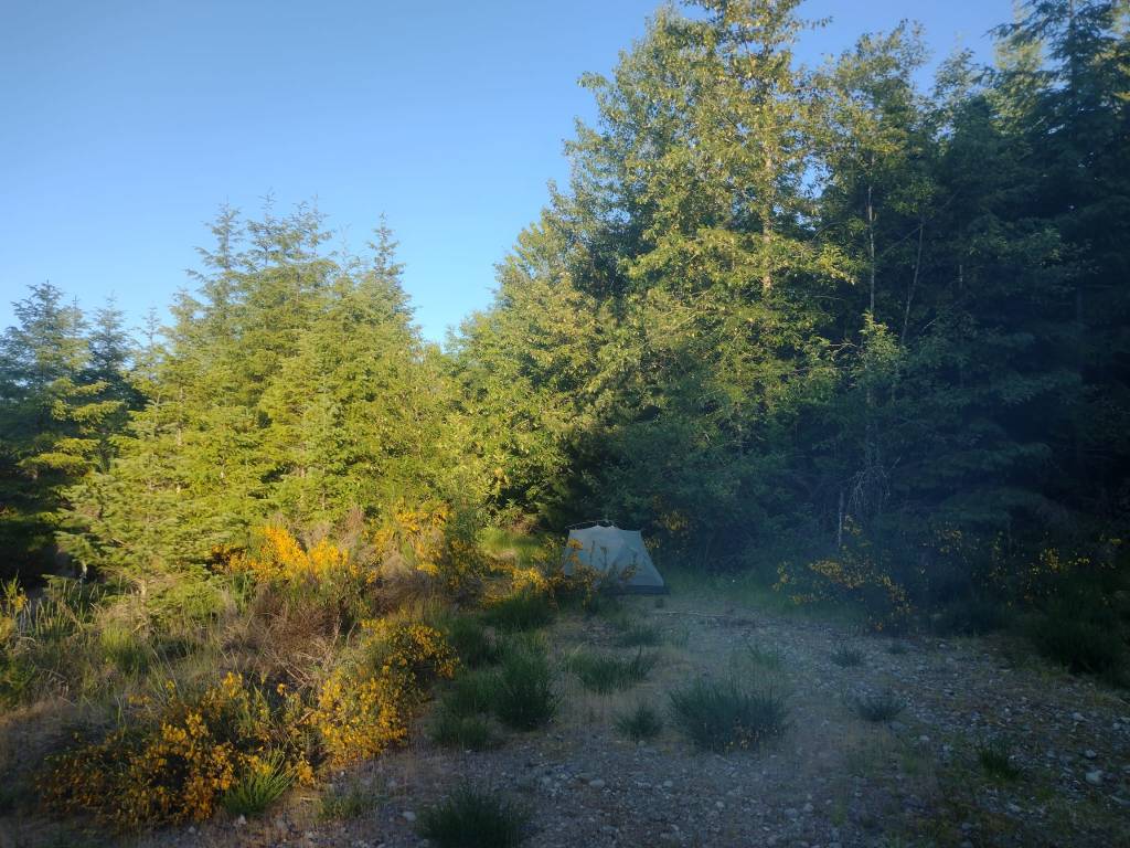 De volgende dag deed ik rustig aan, de moeheid stapelde zich nu een beetje op. Ik nam vele pauzes op prachtige plekjes: in een zacht mosbed; op een klif boven de rivier; en op een strandje bij de rivier om te kunnen zwemmen. Het leek me slim om daar alvast eten te koken en af te wassen, zodat ik voor mijn kampeerplek niet afhankelijk was van water. Ik vond ’s avonds een prima plek, niet zo boeiend, en zette ook eens de buitentent op. Het voelde wat beschutter en in combinatie met een zware ibuprofen hoopte ik op een goede nachtrust.