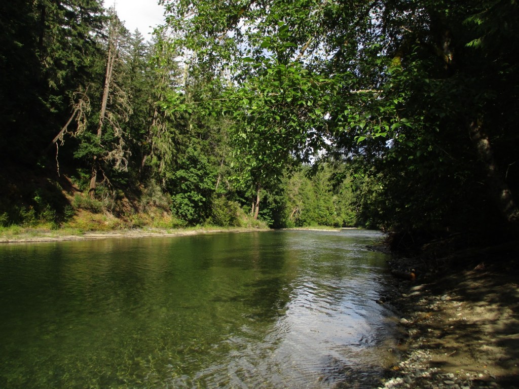 Parallel aan het fietspad liep nu een wandelpad door een prachtig jungle-achtig bos, die helemaal meeboog met de bochten van de rivier. Er was geen mens te zien en ik gokte zo dat er een hoop wildlife was. Ik nam een duik in de rivier vanaf een mooi strandje en voelde me de koningin des levens, hier, omgeven door bos en wild en rivier en zon.