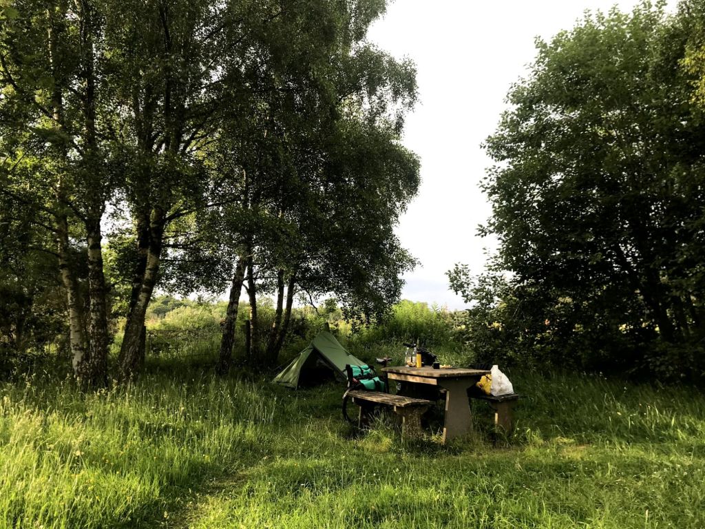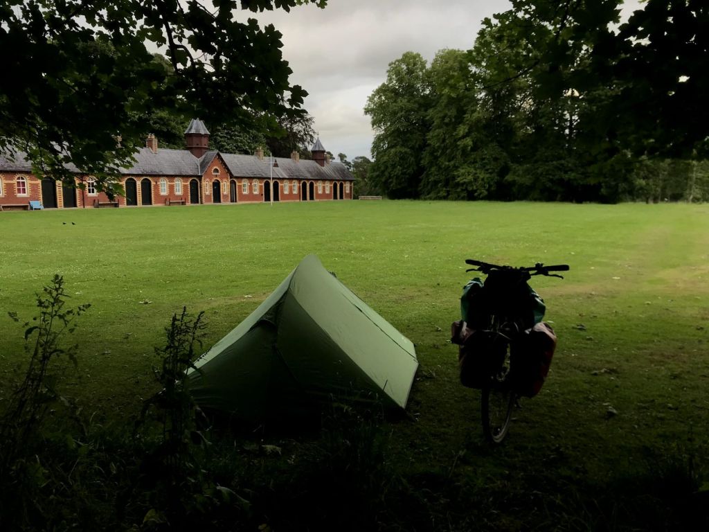 Na zes rondjes gefietst te hebben maar me super oncomfortabel te voelen bij alle plekken (denk even aan picknickbanken bij vijvertjes, maar dan ook nog met een kasteel op de achtergrond) en niet wetende of het hier überhaupt wel mocht (waarschijnlijk niet, het was immers geen openbaar gebied) sprak ik een vrouw aan – de enige persoon die ik die avond had gezien. Wat zij ervan dacht? Ze wees naar een groot grasveld bij het toiletgebouw. Hier zag ze wel eens scoutinggroepen kamperen, dus het zou vast geen kwaad kunnen, dacht zij. Ze deed er zo relaxt over dat ik ook wat ontspande. Ik had gezocht naar een verstopplek, maar soms is heel openbaar gewoon beter! En hier zo vlakbij de toiletten was eigenlijk heel chill!
