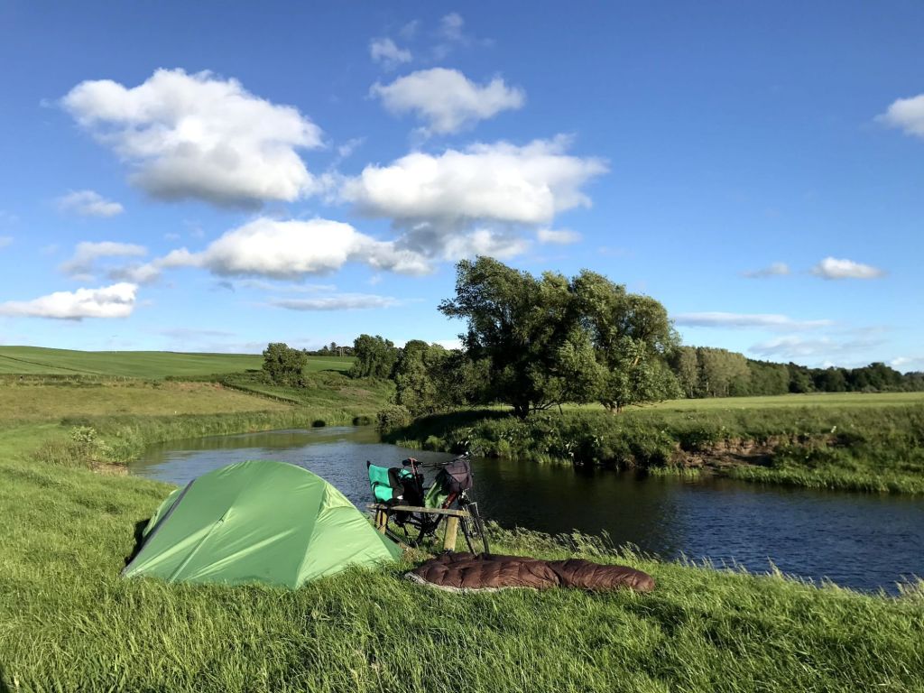 Hoewel ik door het opladen een paar uur gemist had, is het hier lang licht en vind ik het lekker wat langer door te fietsen ’s avonds. Als rond een uur of acht mijn tent staat heb ik nog genoeg tijd om wat te eten en te chillen en dan kan ik ook naar bed. Als ik al eerder aankom is de avond zo lang, ga ik me vervelen en val ik daardoor juist niet in slaap. Dus dit werkt perfect! Op de valreep vond ik een mooi plekje aan de rivier waar ik genoot van de avondzon. Ook hier was het weer magisch stil ’s nachts en sliep ik fantastisch. Maar, wel best koud! Mijn mummieslaapzak had ik helemaal dichtgeritst en ik had zelfs mijn merino thermoshirt aan.