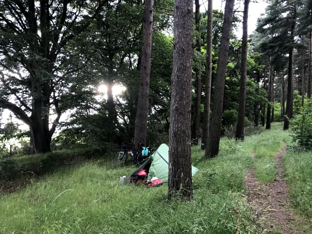 Het was inmiddels al acht uur en ik was op, met weer ruim 25 kilometer in de benen. Ik sleepte mijn spullen naar het pad en zette mijn tent in de berm op. De bomen verhinderden mijn uitzicht, mijn haringen wilden nauwelijks in de stenige grond en ik werd tóch ook belaagd door midges. Ik dook de tent in en kon nauwelijks een kopje thee zetten zonder een wolk van die beesten in mijn binnentent te laten. Bezweet en moe ging ik liggen en toen besefte ik ook nog eens dat een generator-achtig geluid op de achtergrond bromde, alles zat tegen! Ik at wraps en een yoghurtje en lag vervolgens tot drie uur ’s nachts klaarwakker van het late eten en stijve spieren. Ik bedacht een prioriteitenlijstje voor kamperen: 1. Veilig (✅) 2. Plat (✅) 3. Zachte grond (❌) 4. Stil (❌). En ik zou eerder moeten avondeten en überhaupt eerder moeten stoppen.