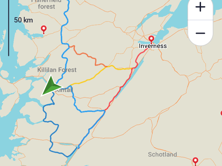 Vanuit Inverness deed ik een stukje rood, dan geel, dan een stukje lichtblauw Rood: Great Glen Way (overlap met lichtblauw)